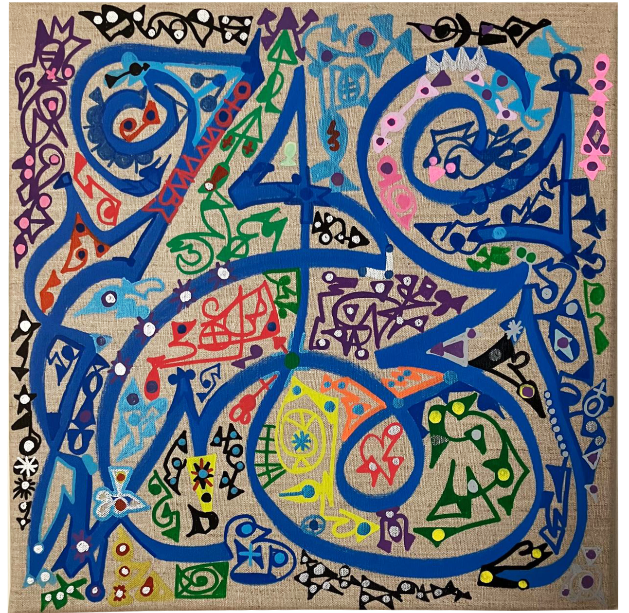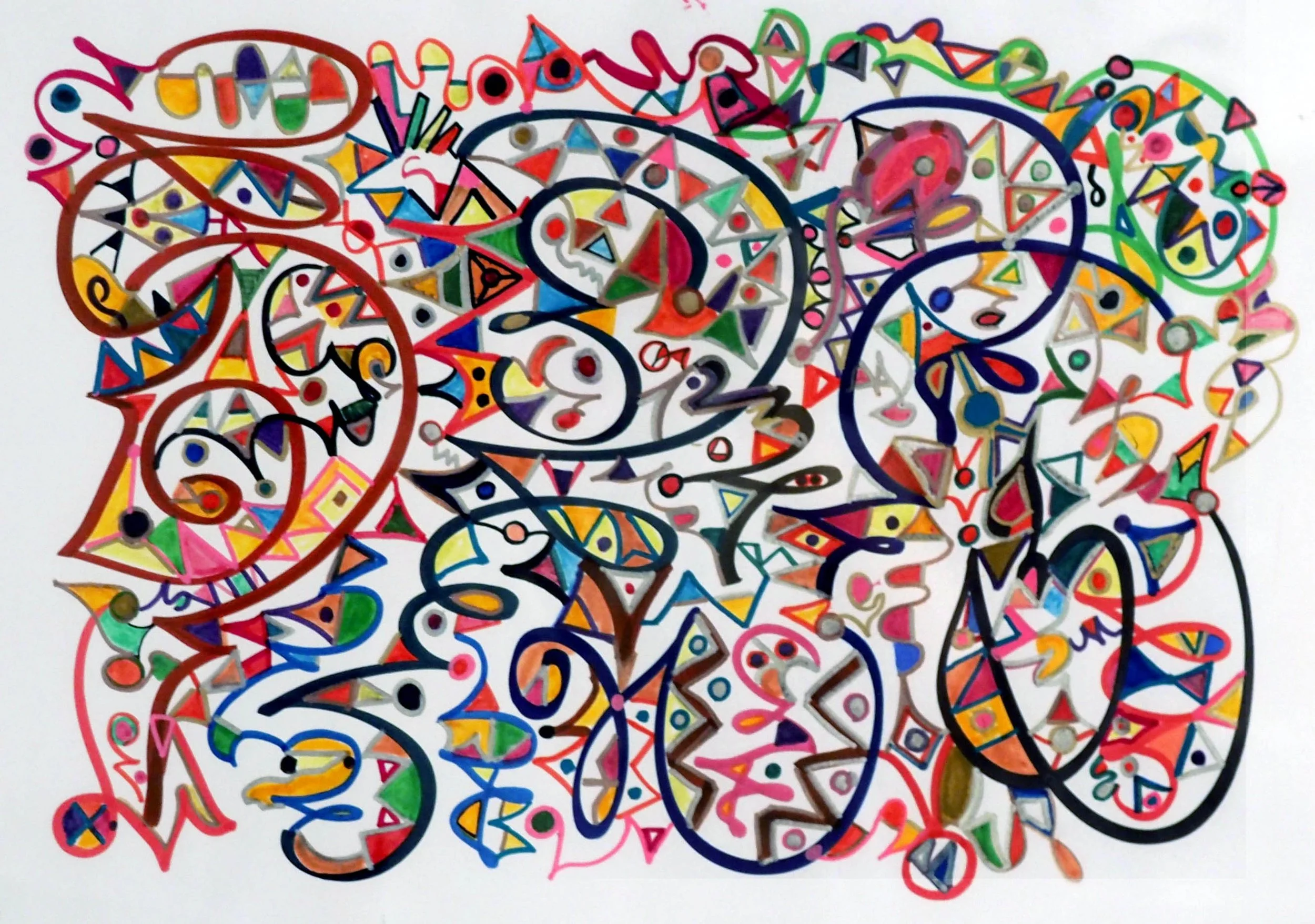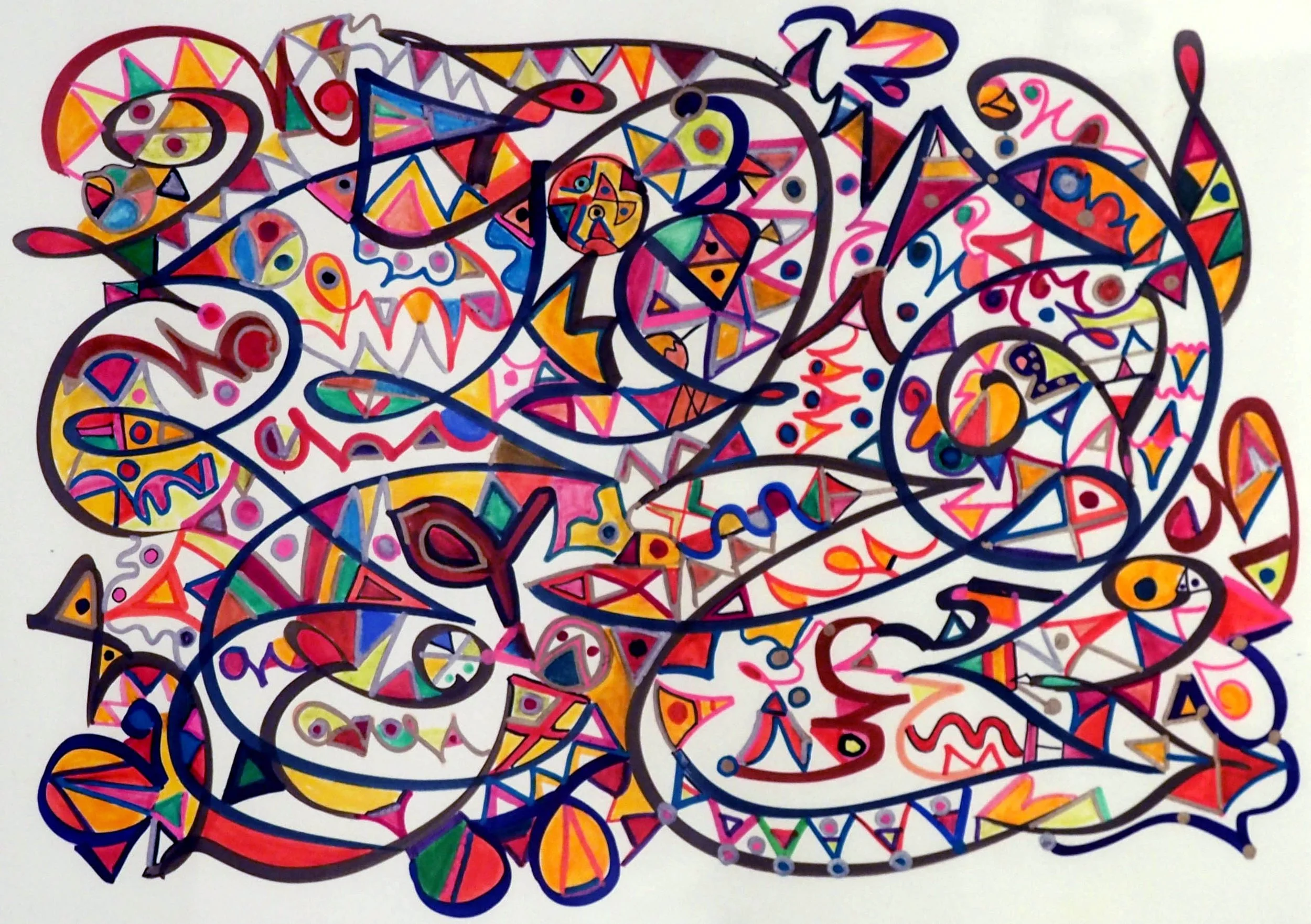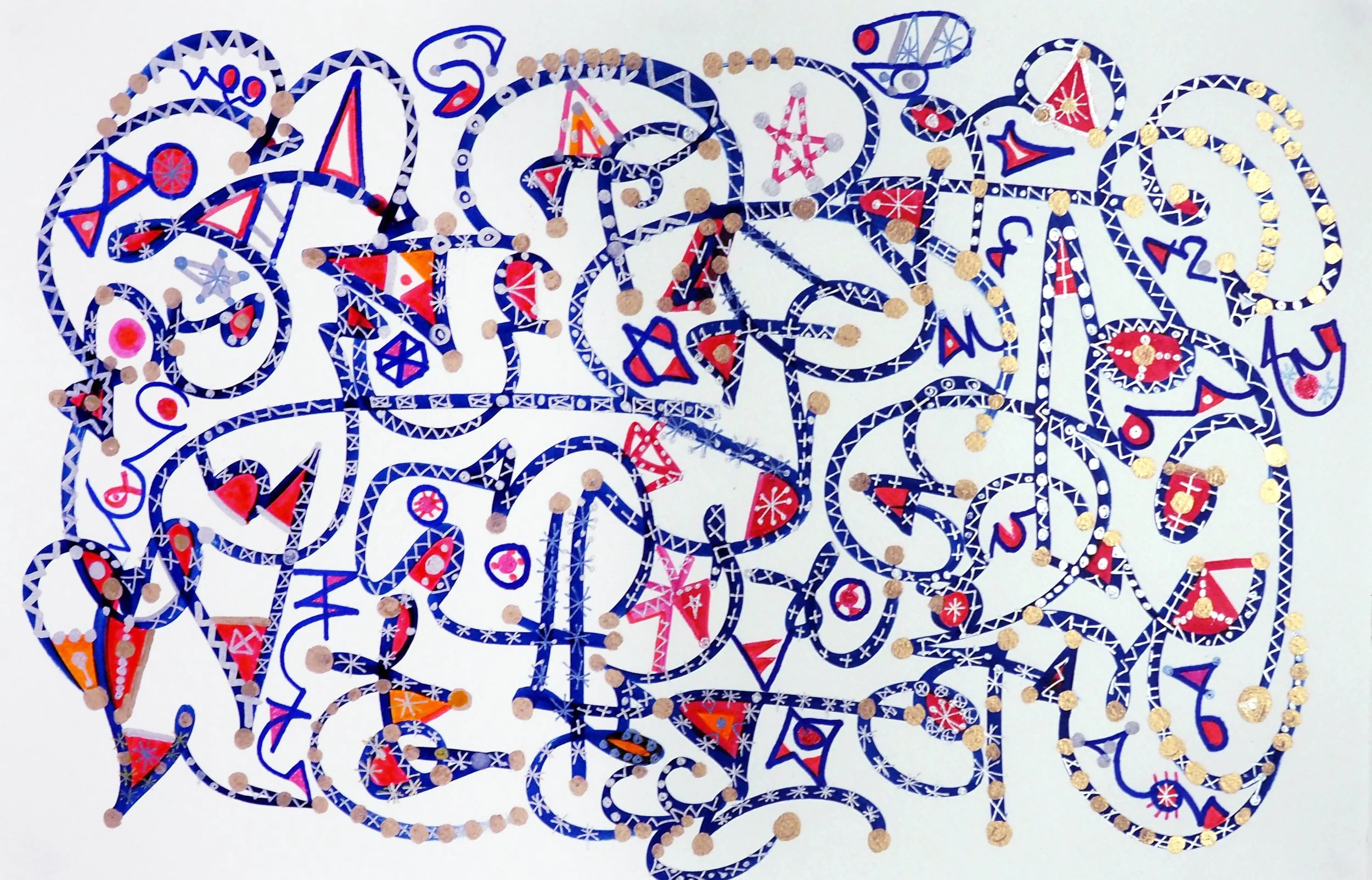 She chooses not to write full words, but focuses on letters then shapes inspired by Moroccan colours and Arabesque shapes.
