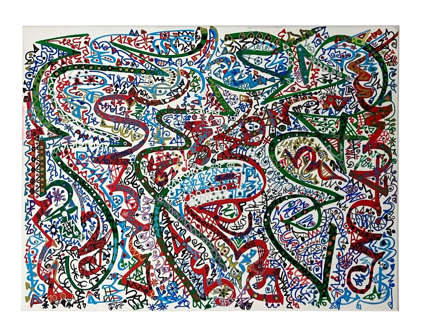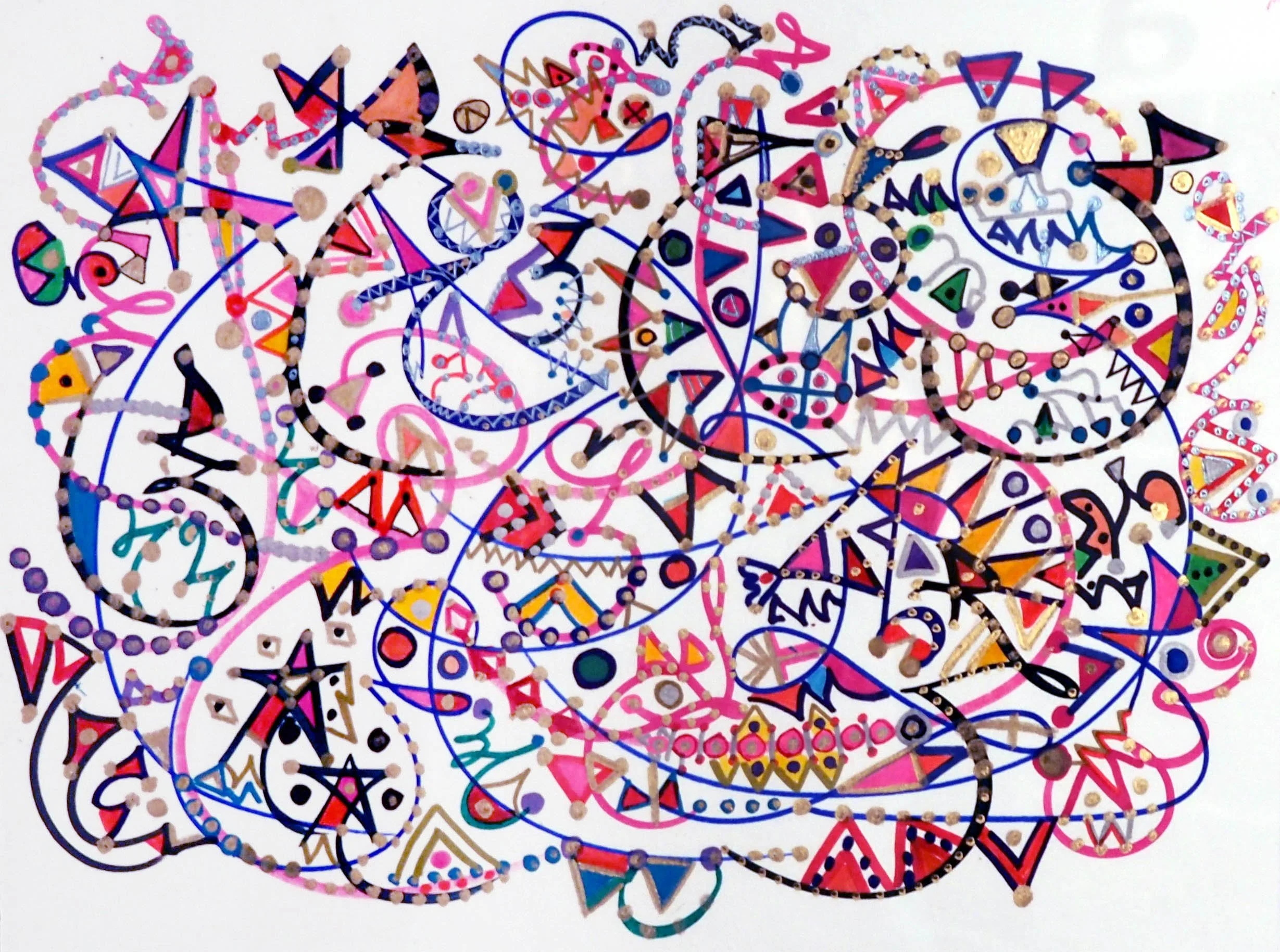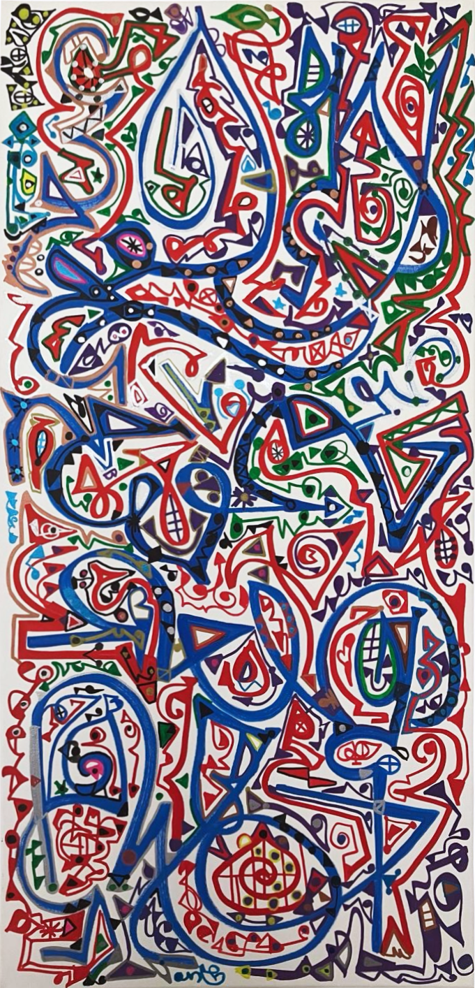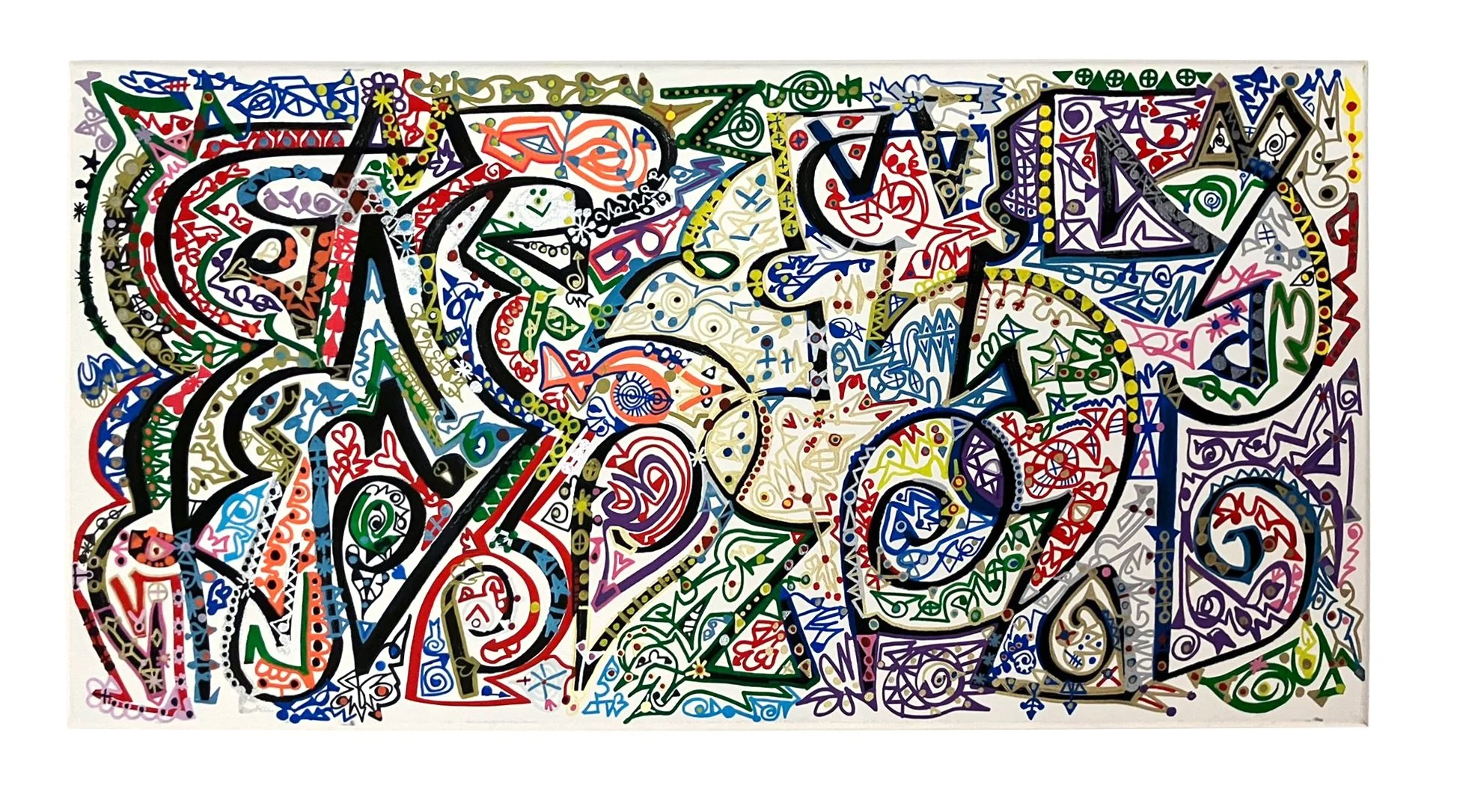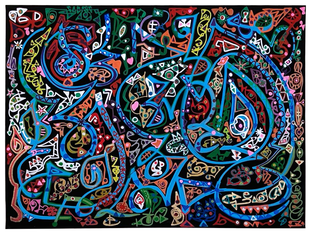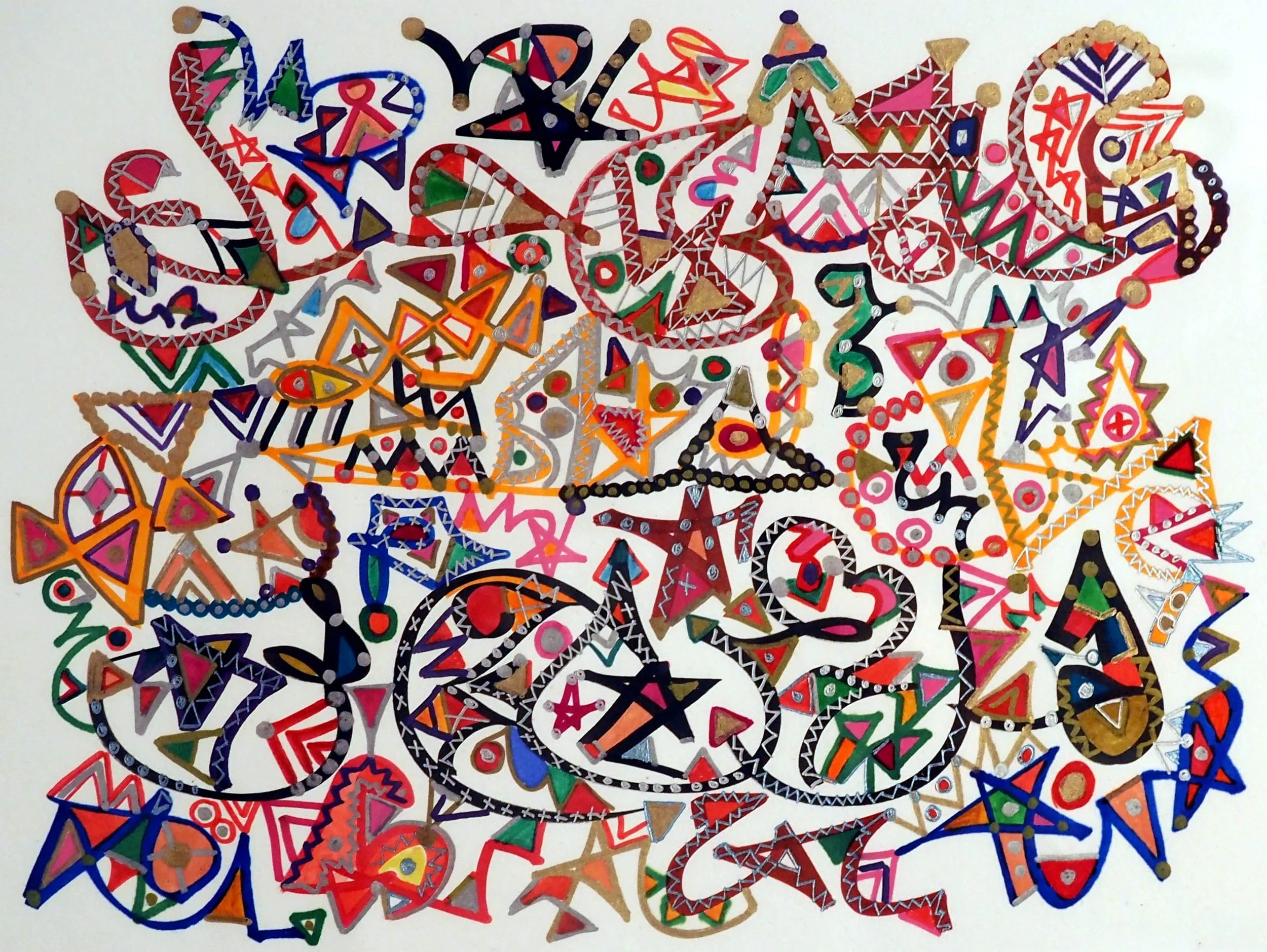 She chooses not to write full words, but focuses on letters then shapes inspired by Moroccan colours and Arabesque shapes.